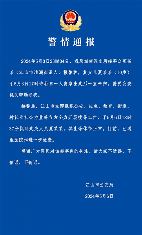 央視網(wǎng)消息:據(jù)江山公安微信公眾號消息,5月6日,浙江衢州江山市公安局通報,5月3日23時34分,警方接群眾項某某(江山市清湖街道人)報警稱,其女兒夏某某(10歲)于5月3日17時許獨自一人離家出走后一直未歸,需要公安機關幫助尋找。接警后,江山市立即組織公安、應急、教育、街道、村社及社會力量等各方全力開展搜尋工作,于5月6日18時37分找到走失人員夏某某,其生命體征正常,目前,已送至醫(yī)院作進一步檢查。