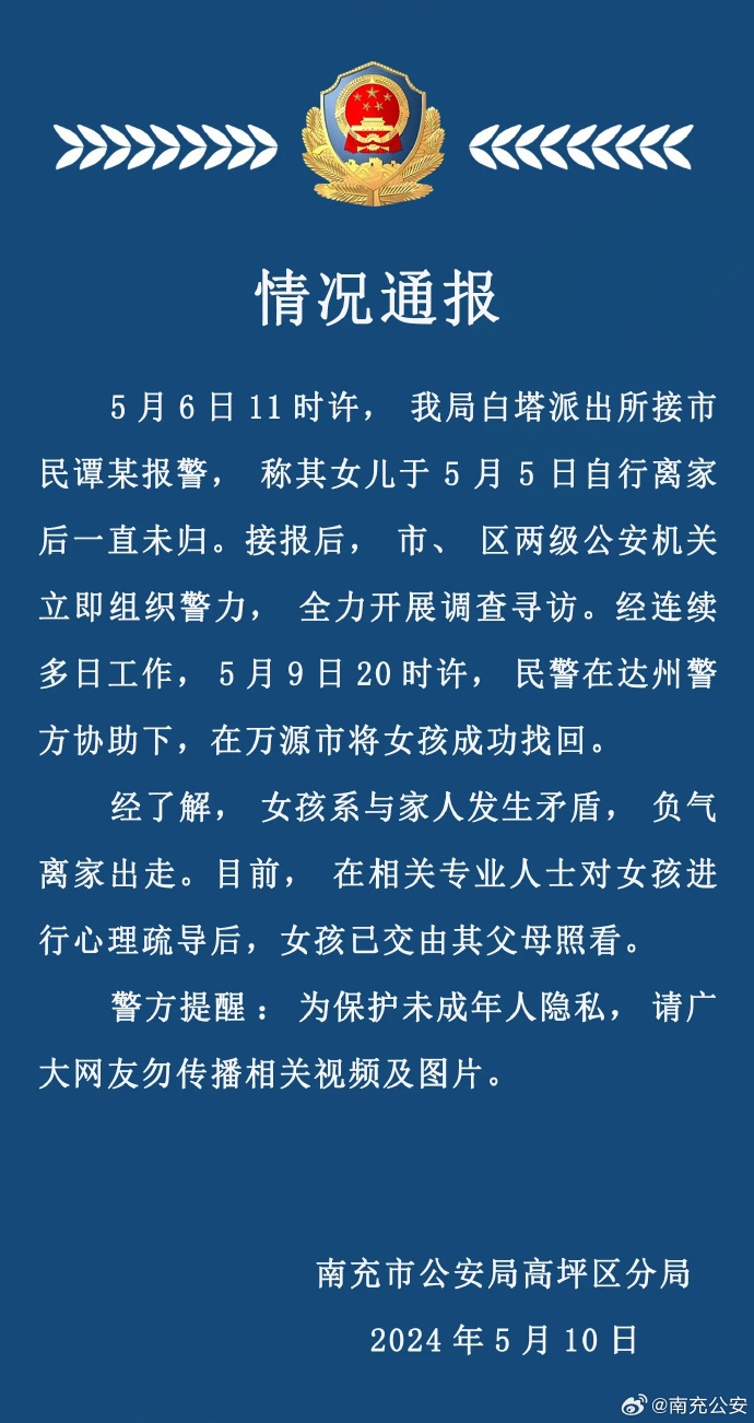 央視網(wǎng)消息:據(jù)@南充公安 微博通報,5月6日11時許,南充市公安局高坪區(qū)分局白塔派出所接市民譚某報警,稱其女兒于5月5日自行離家后一直未歸。接報后,市、區(qū)兩級公安機關(guān)立即組織警力,全力開展調(diào)査尋訪。經(jīng)連續(xù)多日工作,5月9日20時許,民警在達州警方協(xié)助下,在萬源市將女孩成功找回。經(jīng)了解,女孩系與家人發(fā)生矛盾,負氣離家出走。目前,在相關(guān)專業(yè)人士對女孩進行心理疏導后,女孩已交由其父母照看。