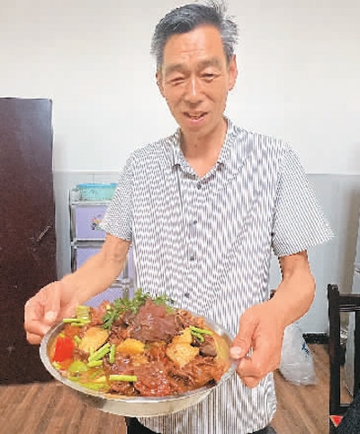 盧守峰展示燒制的新疆大盤雞。本報記者 趙 昊攝