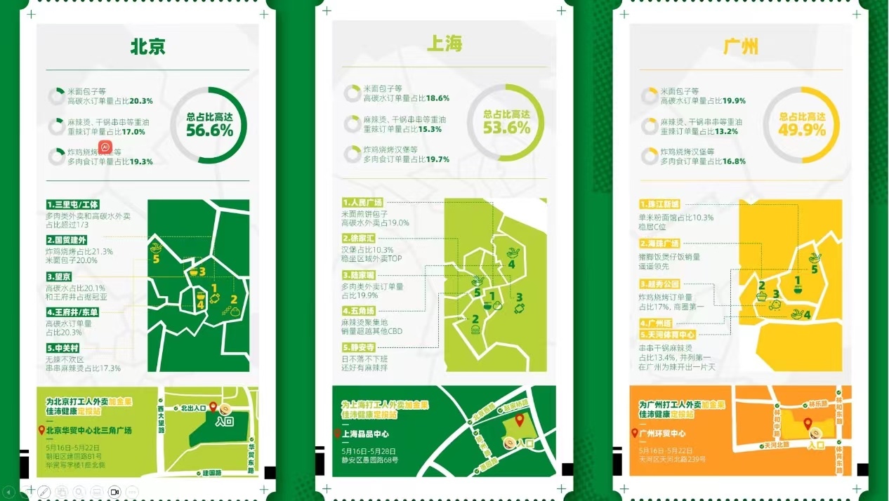《報(bào)告》以北京、上海、廣州三地,共15個(gè)CBD(中央商務(wù)區(qū))為例,調(diào)查了職場(chǎng)打工人的外賣選擇?!秷?bào)告》發(fā)現(xiàn),北京是三地中選購(gòu)米、面、包子等高碳水食物最多的地區(qū),外賣訂單量占比高達(dá)20.3%。廣州次之,占比達(dá)19.9%,上海雖然在三地中占比最少,但數(shù)據(jù)也達(dá)到了18.6%。對(duì)于炸雞、燒烤、漢堡等多肉食訂單來(lái)說(shuō),上海和北京的訂單量占比不相上下,分別達(dá)到19.7%和19.3%,廣州訂單量占比16.8%。而在麻辣燙、干鍋、串串等重油重辣的食物選擇上,北京又一次占據(jù)榜首,訂單量占比達(dá)到17.0%,上海與廣州的占比略低,分別為15.3%和13.2%。