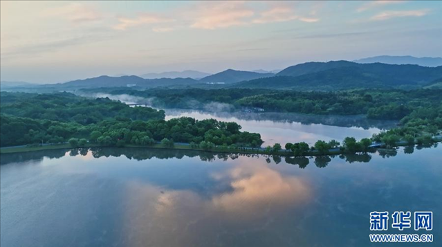 初夏雨后,位于安徽省池州市的平天湖風(fēng)景區(qū)一派恬靜安詳景象,寬闊碧綠的湖面平靜如鏡,倒映著周圍的山巒和樹(shù)木,形成了一幅美麗的山水畫卷。