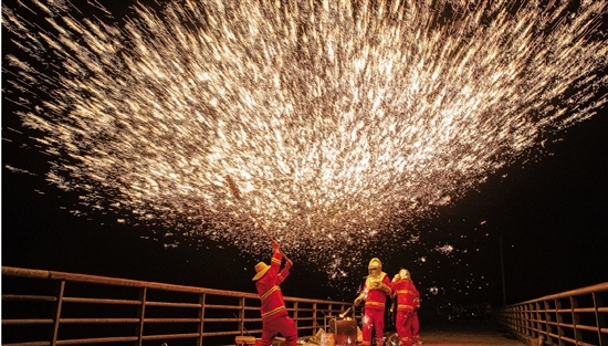 夜幕下,絢麗鐵花在清湖古鎮(zhèn)的老鐵路橋上綻放。