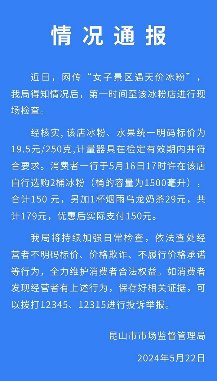 央視網(wǎng)消息:5月22日,江蘇昆山市市場監(jiān)督管理局發(fā)布情況通報(bào):近日,網(wǎng)傳“女子景區(qū)遇天價(jià)冰粉”,我局得知情況后,第一時(shí)間至該冰粉店進(jìn)行現(xiàn)場檢查。經(jīng)核實(shí),該店冰粉、水果統(tǒng)一明碼標(biāo)價(jià)為19.5元/250克,計(jì)量器具在檢定有效期內(nèi)并符合要求。消費(fèi)者一行于5月16日17時(shí)許在該店自行選購2桶冰粉(桶的容量為1500毫升),合計(jì)150元,另加1杯煙雨烏龍奶茶29元,共計(jì)179元,優(yōu)惠后實(shí)際支付150元。