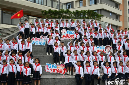 四川省內(nèi)江市東興區(qū)牛牦山小學(xué),新入隊的少先隊員們一起分享獲得紅領(lǐng)巾的喜悅。