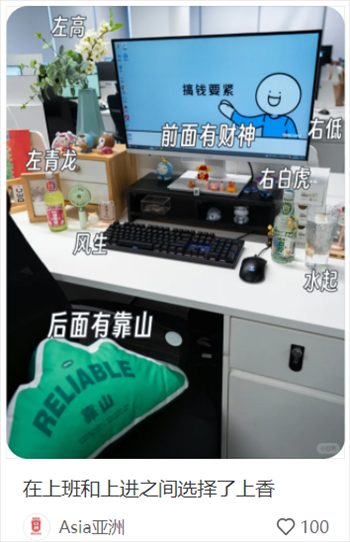 有網(wǎng)友分享工位的風(fēng)水大有講究:擺滿綠植象征欣欣向榮,整體布置左高右低;后背有靠,面不對(duì)門;左靠窗,水杯放左邊,寓意風(fēng)生水起;雜物放桌面左邊,右邊越簡約越好。