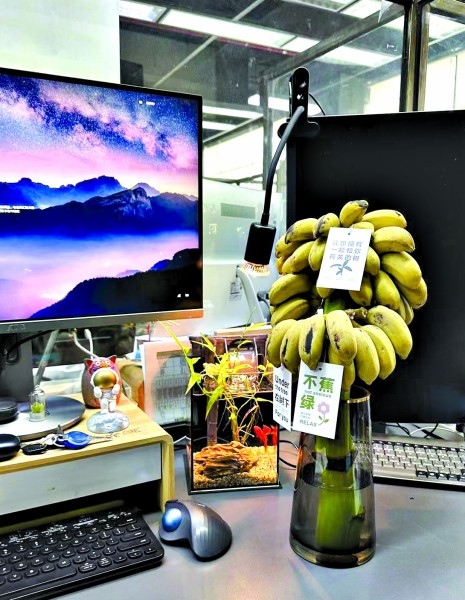 “現(xiàn)在大家工作都挺累的,職場里稍微有一點(diǎn)令人感到驚喜和有趣的話題,大家好像就會(huì)變得很開心。”吳圳是一名桌搭博主,自從他開始在辦公桌上養(yǎng)香蕉之后,單位的很多同事都會(huì)好奇地走過來瞧瞧。