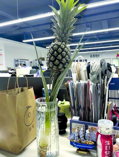 00后楊三日從事新媒體運(yùn)營工作,她在工位上養(yǎng)了一個(gè)菠蘿,“養(yǎng)菠蘿是一件很酷的事情,不僅能觀賞,還能吃,很配我特立獨(dú)行的氣質(zhì)。”她說自從養(yǎng)了菠蘿之后,每天上班時(shí)心情就變得非常好?!拔业墓の痪拖駸釒в炅忠粯?,提前進(jìn)入了春天?!?/p>