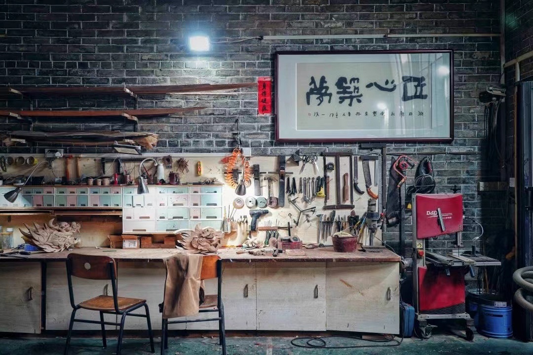 張偉潮工作室門口的牌匾上面寫道:舟艇舫船艄艏艉?!拔仪『迷谶@個年代做了這樣一個選擇,只不過是沖著自己的愛好向往過去?!痹谒磥恚蝗~小舟可生萬物,萬事再繁復總會返璞歸真。眼前人來人往,日子匆匆又漫長,時間仿佛在張偉潮手中靜止,在這間青磚祠堂里,唯有龍頭跨越千年熠熠生輝。