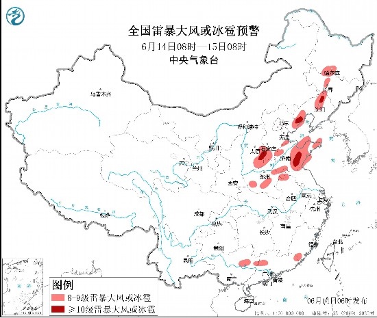 圖2 全國雷暴大風(fēng)或冰雹預(yù)警圖(6月14日08時(shí)-15日08時(shí))