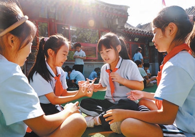 北京市東城區(qū)黑芝麻胡同小學(xué)“課間一刻鐘”,學(xué)生們?cè)谧鲇螒?。黃 超 郭 謙攝影報(bào)道