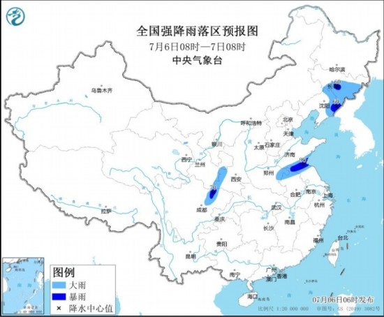 預(yù)計(jì),7月6日08時至7日08時,吉林中東部、遼寧東部、陜西南部、山東南部、河南東部、安徽北部、江蘇北部、四川盆地西北部等地部分地區(qū)有大雨,其中,吉林中東部、遼寧東部、山東南部、江蘇北部、四川盆地西北部等地部分地區(qū)有暴雨(50~90毫米)。上述部分地區(qū)伴有短時強(qiáng)降水(最大小時降雨量20~50毫米,局地可超過60毫米);吉林東部、遼寧東部、山東南部、河南東部、安徽北部、江蘇北部等地的部分地區(qū)將有8-10級雷暴大風(fēng)或冰雹天氣。中央氣象臺7月6日06時發(fā)布暴雨藍(lán)色預(yù)警和強(qiáng)對流天氣藍(lán)色預(yù)警。
