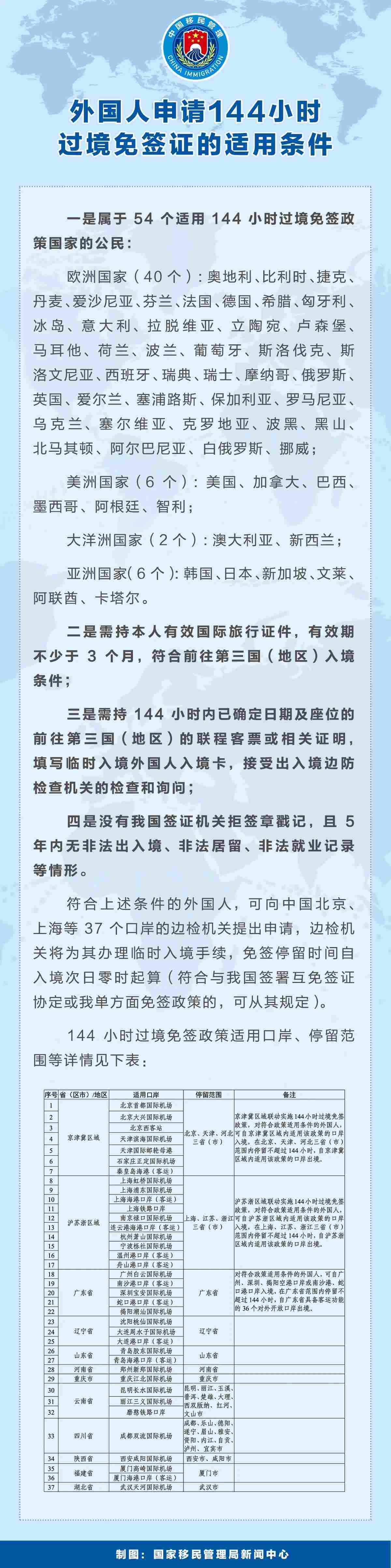 據(jù)了解,截至目前,國家移民管理局已在北京,天津,河北石家莊、秦皇島,遼寧沈陽、大連,上海,江蘇南京、連云港,浙江杭州、寧波、溫州、舟山,河南鄭州,廣東廣州、深圳、揭陽,山東青島,重慶,四川成都,陜西西安,福建廈門,湖北武漢,云南昆明、麗江、西雙版納等地的37個口岸實(shí)施144小時過境免簽政策。美國、加拿大、英國等54國公民持有效國際旅行證件和144小時內(nèi)確定日期及座位的聯(lián)程客票從上述口岸過境前往第三國(地區(qū)),可免辦簽證在規(guī)定區(qū)域內(nèi)停留不超過144小時,停留期間可從事旅游、商務(wù)、訪問、探親等短期活動(符合與我國簽署互免簽證協(xié)定或我單方面免簽政策的,可從其規(guī)定)。