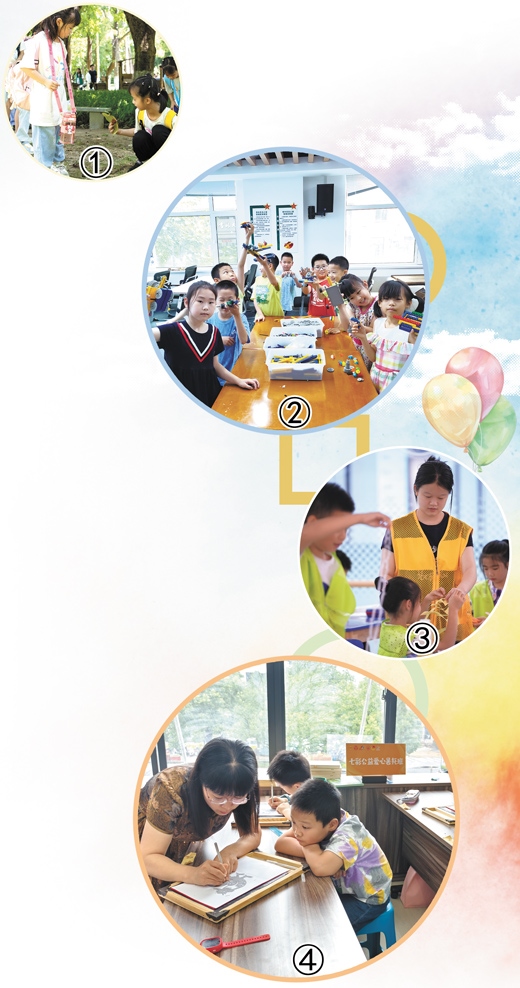 圖①:廣東省佛山市高明區(qū)組織孩子們到森林公園游覽,將研學(xué)實(shí)踐融入暑期托管。賀林平 劉鳳平攝影報(bào)道圖②:吉林省長(zhǎng)春市義和社區(qū)暑期托管班里,孩子們?cè)谡故臼止ぷ髌?。?玥攝 圖③:湖北省武漢市一個(gè)寫字樓里的暑期托管班,志愿者在照看孩子。共青團(tuán)武漢市武昌區(qū)委供圖 圖④:江蘇省宜興市振興社區(qū)暑期托管班里,老師給孩子們示范手工刻紙。趙 霞攝