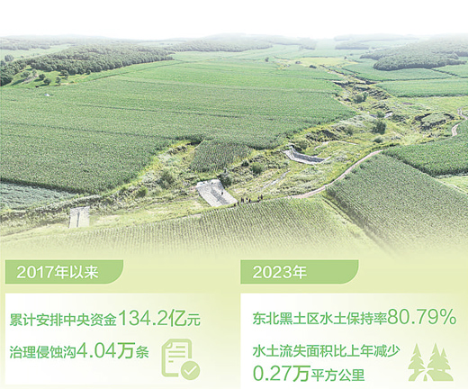 治理取得明顯成效。“十四五”以來,累計治理侵蝕溝3.3萬條,保護和恢復(fù)耕地792萬畝,每年可增加糧食綜合生產(chǎn)能力1.9億斤。據(jù)統(tǒng)計,2023年增發(fā)國債用于支持侵蝕溝治理項目,可保護耕地面積約665萬畝,年增加糧食產(chǎn)量約1.6億斤;恢復(fù)和新增耕地約8000畝,年可增加糧食產(chǎn)量約1200萬斤?!扒治g溝治理項目的實施,還能完善耕地徑流調(diào)控體系,增強溝道排水能力,降低洪澇災(zāi)害風險。”馮偉表示。