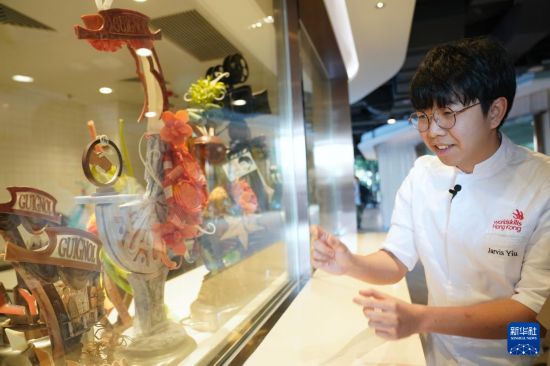 在香港國(guó)際廚藝學(xué)院西點(diǎn)廚房,姚浩民在介紹“2024年里昂世界技能大賽”西點(diǎn)制作項(xiàng)目的銀牌作品(1月15日攝)。新華社發(fā)(王申攝)