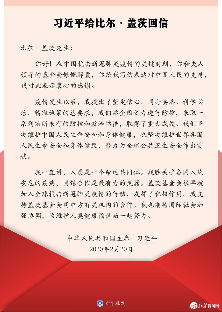2月20日,在給美國蓋茨基金會(huì)聯(lián)席主席比爾·蓋茨的回信中,習(xí)近平主席這樣寫道。