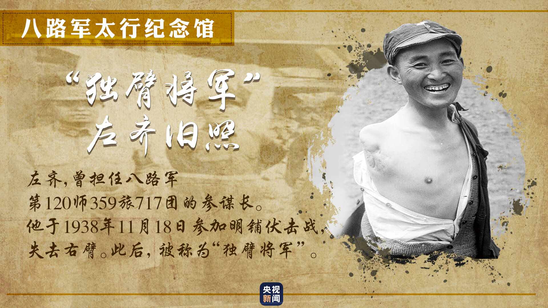 一張獨(dú)臂將軍的舊照,展現(xiàn)出八路軍為爭取民族獨(dú)立,不怕犧牲、不畏艱險(xiǎn)的革命英雄主義精神。