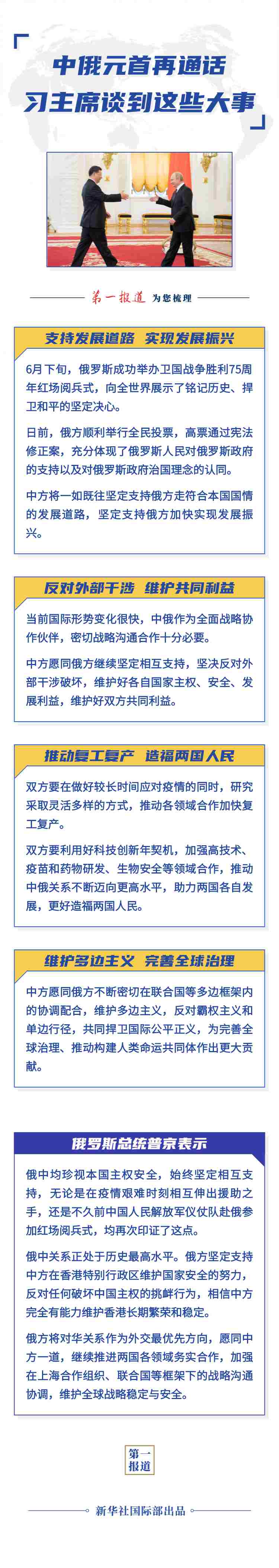 普京表示,近日俄羅斯全民投票高票通過憲法修正案,有助于維護(hù)俄長(zhǎng)期政治穩(wěn)定,更好捍衛(wèi)國(guó)家主權(quán),反對(duì)外部干涉。俄中均珍視本國(guó)主權(quán)安全,始終堅(jiān)定相互支持,無論是在疫情艱難時(shí)刻相互伸出援助之手,還是不久前中國(guó)人民解放軍儀仗隊(duì)赴俄參加紅場(chǎng)閱兵式,均再次印證了這點(diǎn)。俄中關(guān)系正處于歷史最高水平。俄方堅(jiān)定支持中方在香港特別行政區(qū)維護(hù)國(guó)家安全的努力,反對(duì)任何破壞中國(guó)主權(quán)的挑釁行為,相信中方完全有能力維護(hù)香港長(zhǎng)期繁榮和穩(wěn)定。俄方將對(duì)華關(guān)系作為外交最優(yōu)先方向,愿同中方一道,繼續(xù)推進(jìn)兩國(guó)各領(lǐng)域務(wù)實(shí)合作,加強(qiáng)在上海合作組織、聯(lián)合國(guó)等框架下的戰(zhàn)略溝通協(xié)調(diào),維護(hù)全球戰(zhàn)略穩(wěn)定與安全。