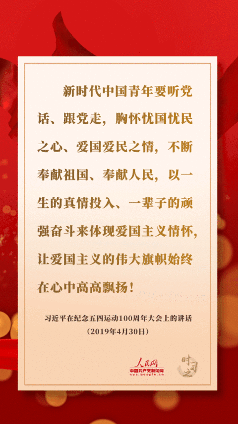 新時(shí)代中國青年要聽黨話、跟黨走,胸懷憂國憂民之心、愛國愛民之情,不斷奉獻(xiàn)祖國、奉獻(xiàn)人民,以一生的真情投入、一輩子的頑強(qiáng)奮斗來體現(xiàn)愛國主義情懷,讓愛國主義的偉大旗幟始終在心中高高飄揚(yáng)!