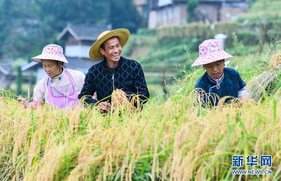 貴州省從江縣加榜鄉(xiāng)加車(chē)村的農(nóng)民在收割水稻(2020年9月19日攝)。新華社記者 楊文斌 攝