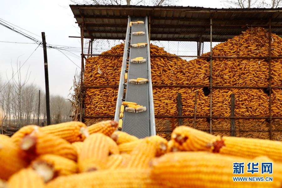 在哈爾濱市巴彥港鎮(zhèn)五星村農(nóng)民程顯義家院內(nèi),玉米通過(guò)傳送帶進(jìn)入玉米架子(2020年11月3日攝)。新華社記者 徐凱鑫 攝