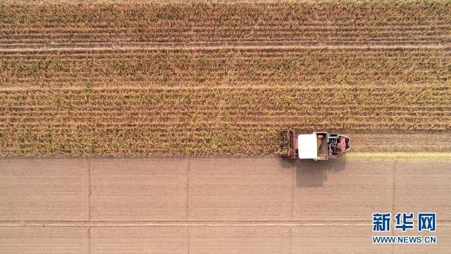 在河北省石家莊市藁城區(qū)梅花鎮(zhèn)朱家莊村的大豆田地里,農(nóng)戶(hù)駕駛農(nóng)機(jī)收割大豆(2020年10月10日攝,無(wú)人機(jī)照片)。新華社發(fā)(梁子棟 攝)