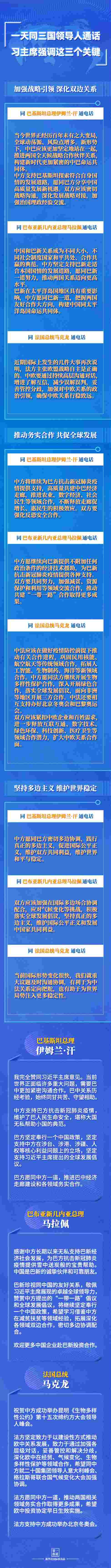中國(guó)和巴基斯坦是“全天候戰(zhàn)略合作伙伴關(guān)系”;中國(guó)和巴新是“不同大小、不同社會(huì)制度國(guó)家和平共處、合作共贏的典范”;中國(guó)和法國(guó)同為聯(lián)合國(guó)安理會(huì)常任理事國(guó)……3次通話內(nèi)容豐富,“第一報(bào)道”為您梳理——