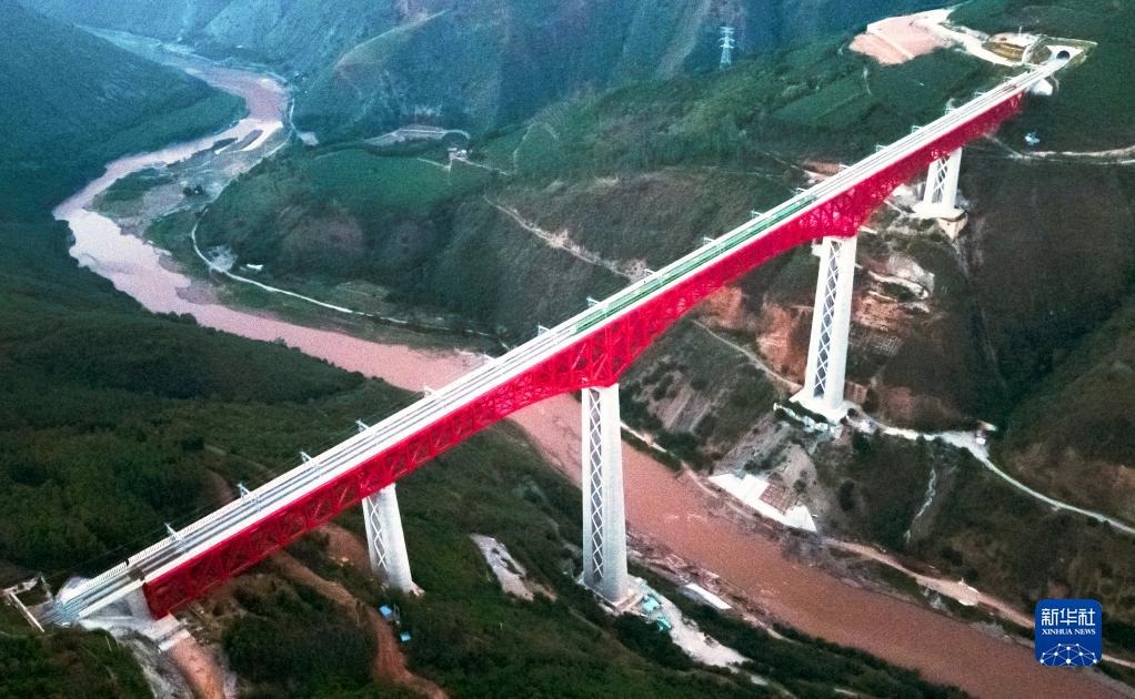 中老鐵路首發(fā)列車駛過中國云南省元江哈尼族彝族傣族自治縣境內(nèi)的元江雙線特大橋(12月3日攝,無人機照片)。新華社記者王冠森攝