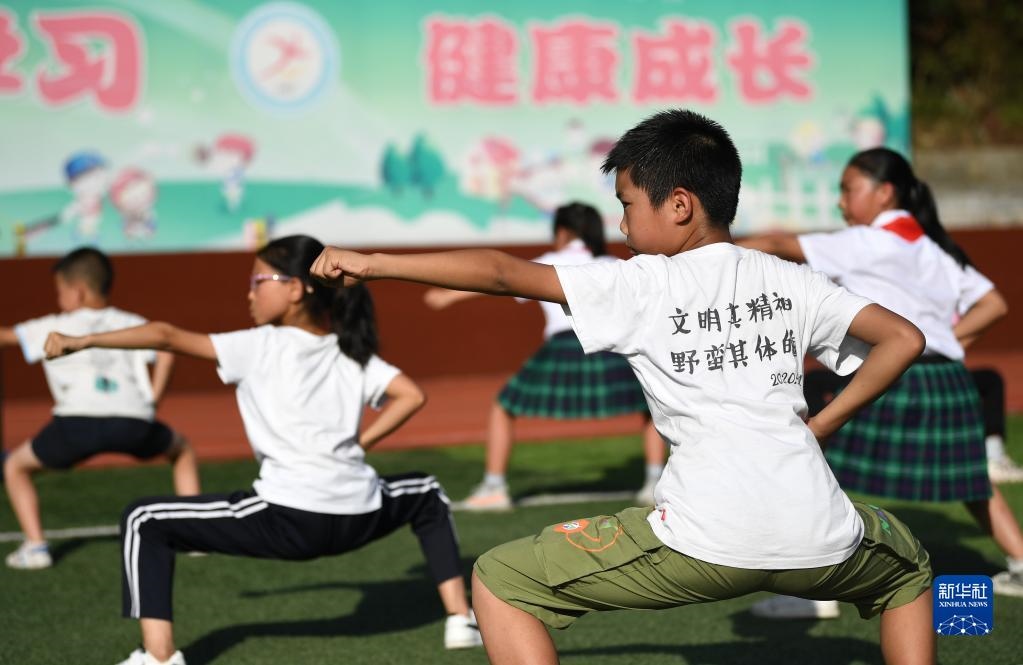 在陜西省安康市平利縣老縣鎮(zhèn)中心小學的操場上,學生們在課后參加武術(shù)社團活動(2020年9月7日攝)。新華社記者 李一博 攝