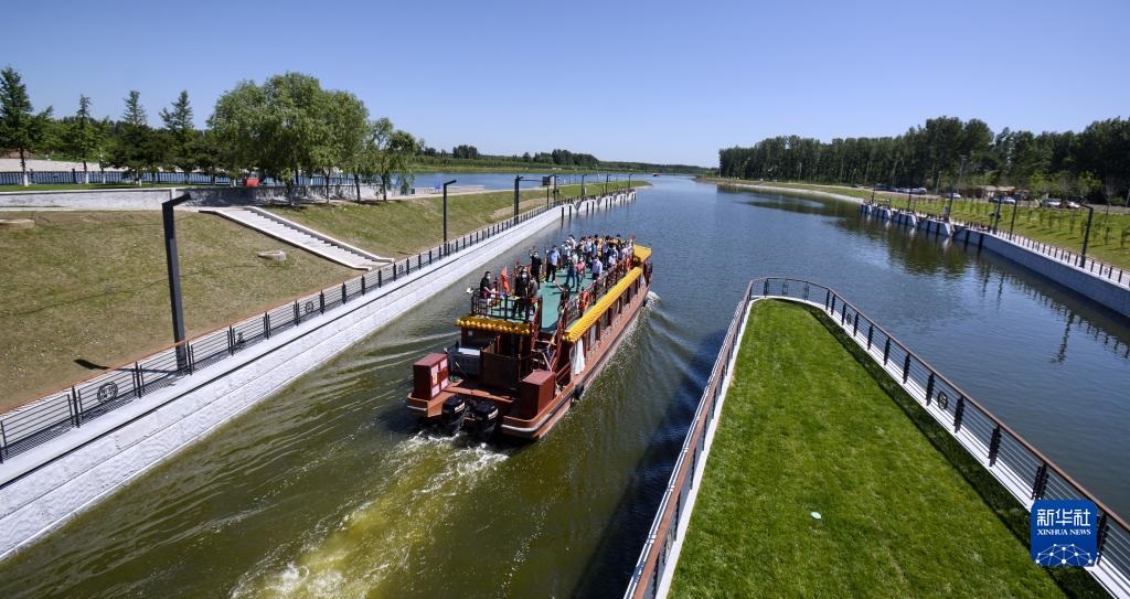 2022年6月24日,京杭大運(yùn)河京冀段全線62公里實(shí)現(xiàn)游船通航。這是載著北京游客和建設(shè)者代表的游船通過(guò)船閘進(jìn)入京杭大運(yùn)河河北段。新華社記者 李欣 攝