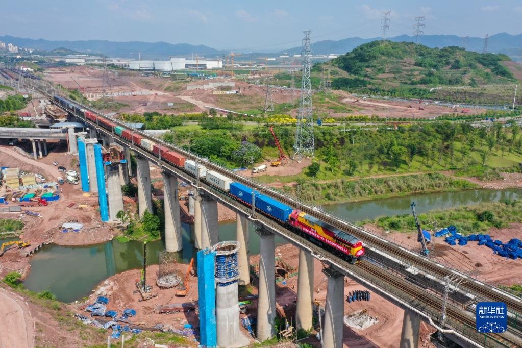 中緬新通道(重慶—臨滄—緬甸)國(guó)際鐵路班列從重慶果園港魚嘴車站順利發(fā)車(5月23日攝,無人機(jī)照片)。新華社記者 唐奕 攝