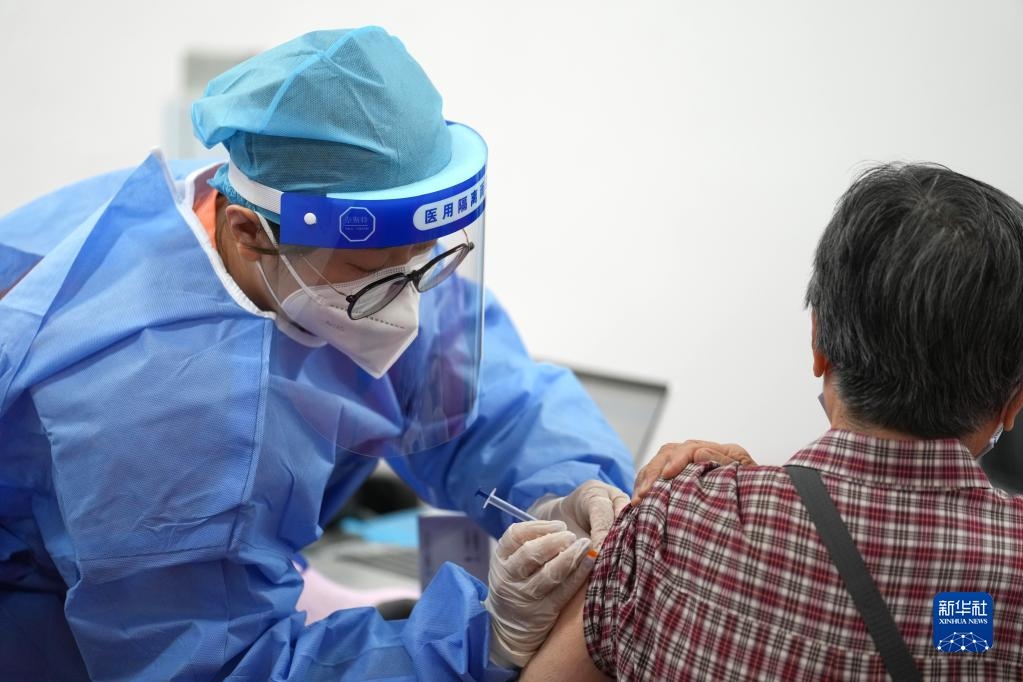 在北京市朝陽區(qū)奧運村街道一處新冠疫苗接種點,醫(yī)護人員為一市民接種新冠疫苗加強針(2022年7月13日攝)。新華社記者鞠煥宗攝
