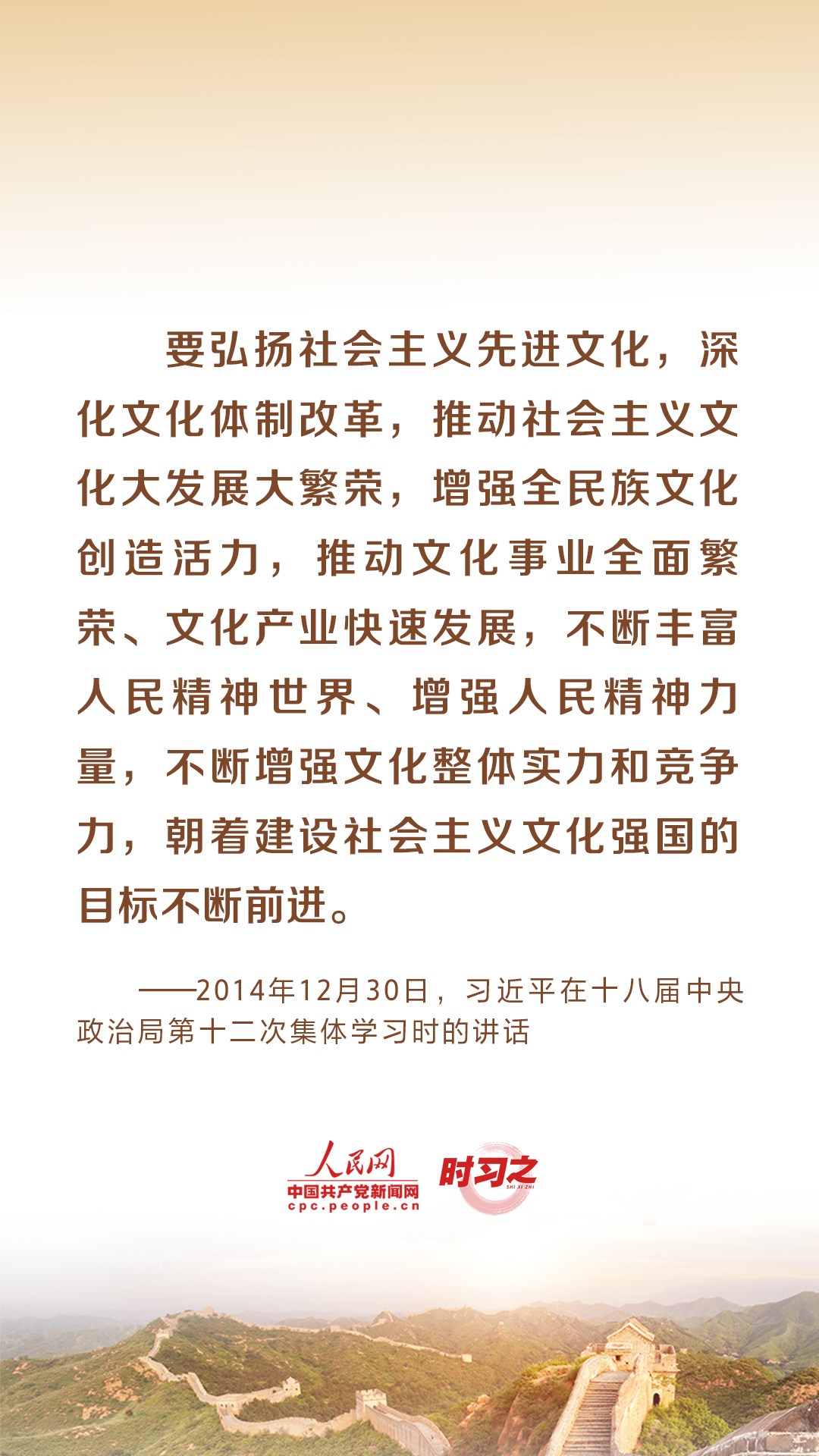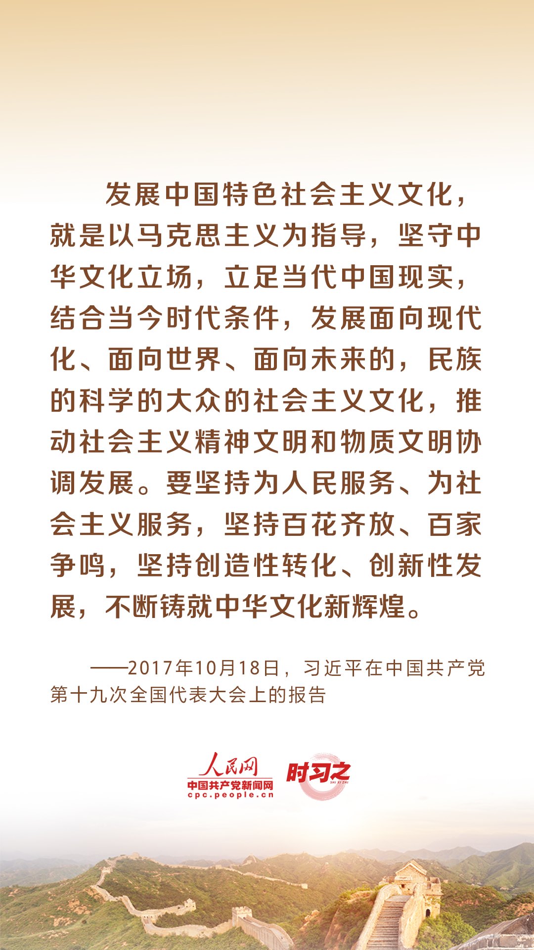 “理論自覺、文化自信,是一個民族進(jìn)步的力量;價值先進(jìn)、思想解放,是一個社會活力的來源。”黨的十八大以來,習(xí)近平總書記就文化建設(shè)提出了一系列新理念新思想新戰(zhàn)略,引領(lǐng)中華文化創(chuàng)造性轉(zhuǎn)化、創(chuàng)新性發(fā)展。推動弘揚和發(fā)展社會主義先進(jìn)文化,習(xí)近平多次作出重要闡釋。
