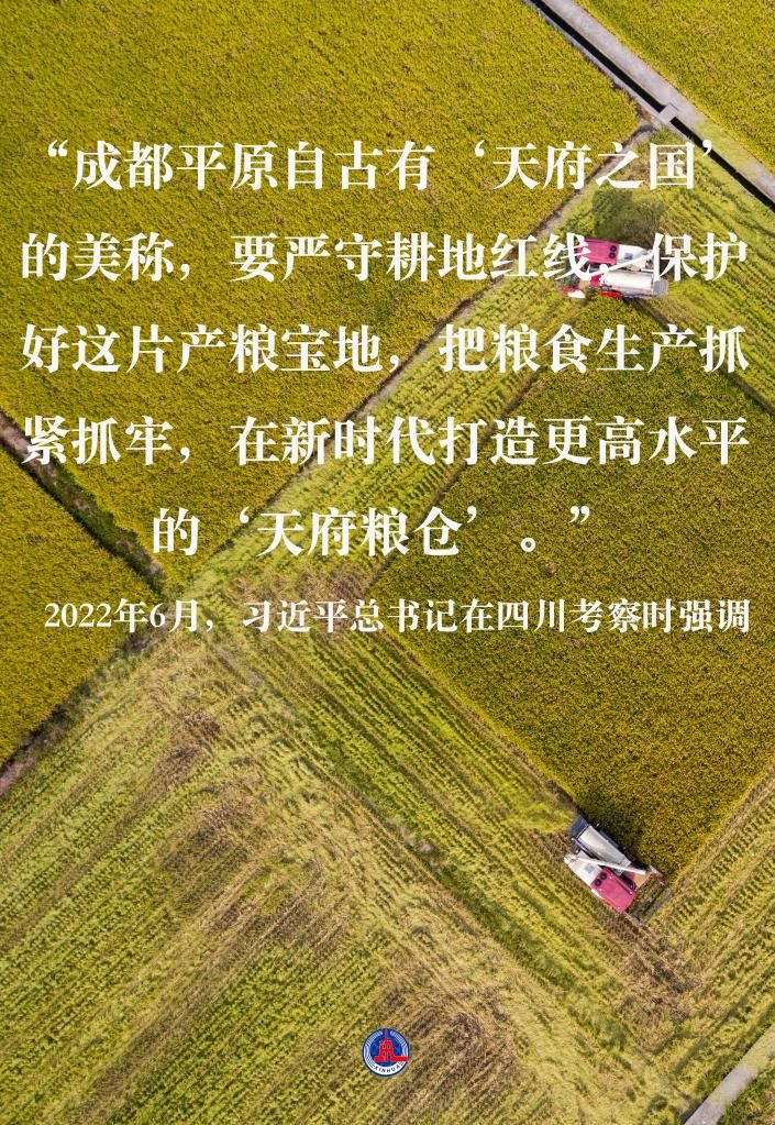 2022年6月,習近平總書記在四川考察時強調,“成都平原自古有‘天府之國’的美稱,要嚴守耕地紅線,保護好這片產糧寶地,把糧食生產抓緊抓牢,在新時代打造更高水平的‘天府糧倉’”。
