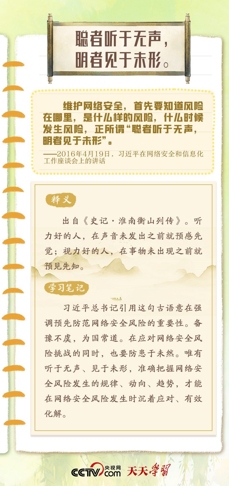 習(xí)近平總書記重視網(wǎng)絡(luò)安全工作,曾多次在講話中以典明理,深刻闡釋網(wǎng)絡(luò)安全工作的重要意義?!熬W(wǎng)絡(luò)安全宣傳周”到來之際,央視網(wǎng)《天天學(xué)習(xí)》特梳理總書記關(guān)于網(wǎng)絡(luò)安全的用典,與您一起學(xué)習(xí)領(lǐng)悟。