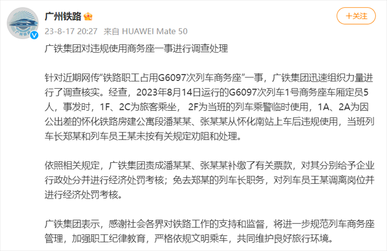 ·廣鐵集團(tuán)回應(yīng)職工占用高鐵商務(wù)座:2人補(bǔ)繳車票,列車長免職。