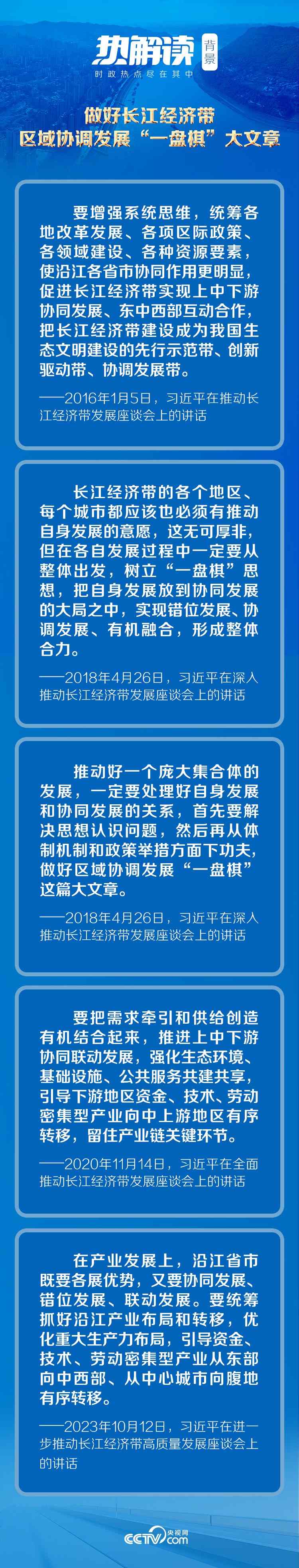 沿江省市如何把自身發(fā)展投入?yún)f(xié)同發(fā)展大局,實現(xiàn)錯位發(fā)展、協(xié)調(diào)發(fā)展、有機融合,形成整體合力?總書記在此次座談會上對沿江省市提出16字鮮明要求——“省際共商、生態(tài)共治、全域共建、發(fā)展共享”。