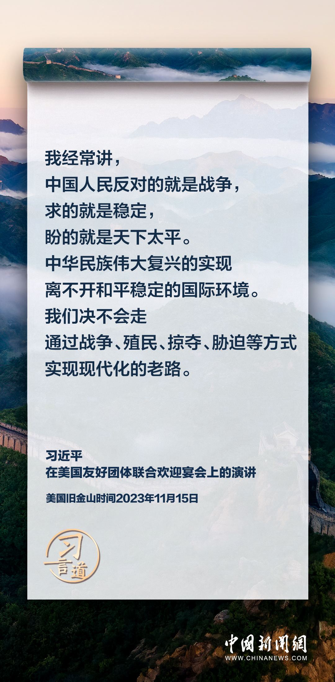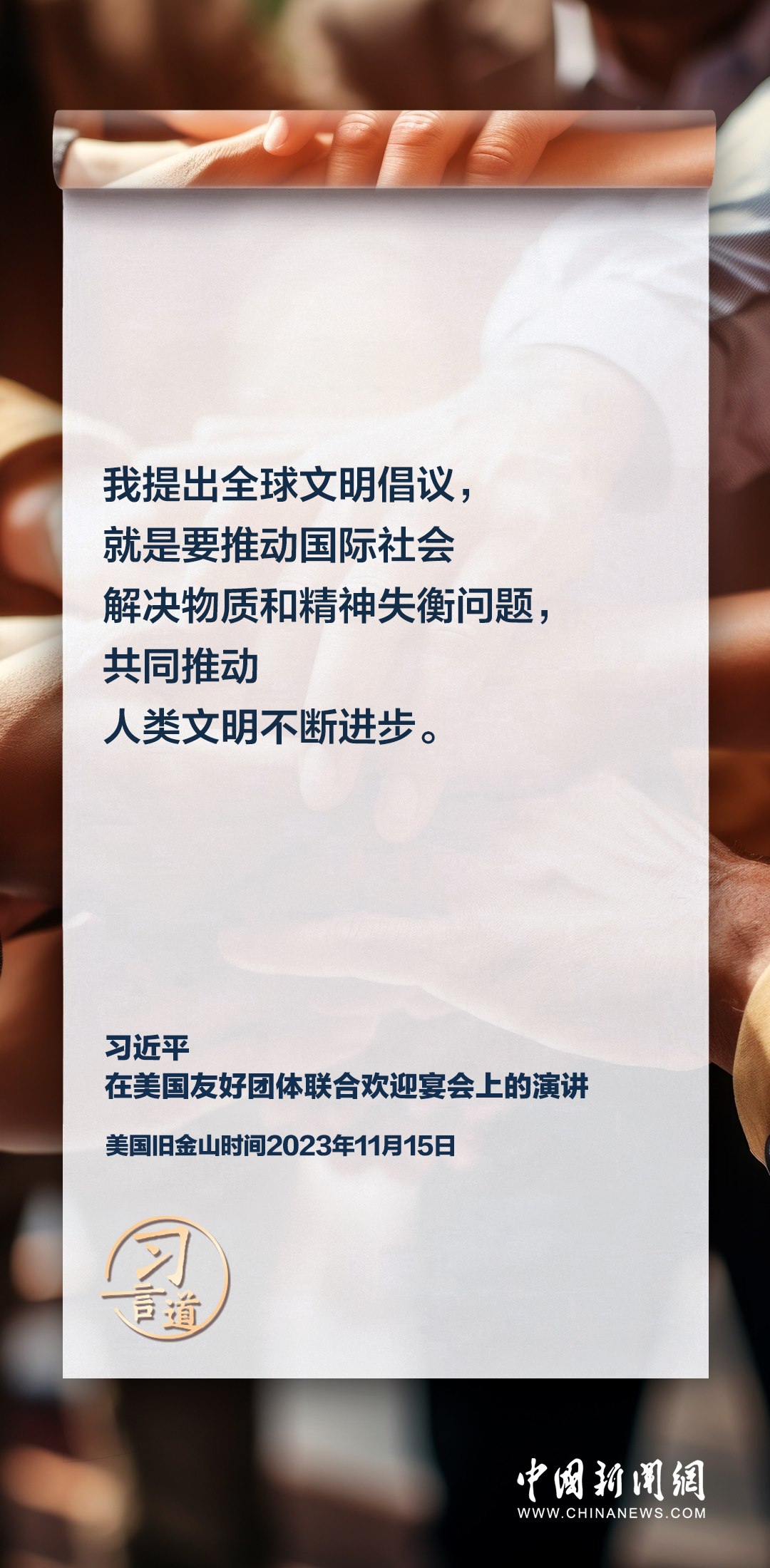 當(dāng)?shù)貢r間11月15日,中國國家主席習(xí)近平在美國舊金山出席美國友好團體聯(lián)合歡迎宴會并發(fā)表演講。習(xí)近平在演講中從“我”和“我們”說起,提出中國主張、表明中國立場、展現(xiàn)大國擔(dān)當(dāng),話語擲地有聲。