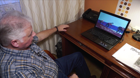 (▲弗拉基米爾·沃羅比約夫觀(guān)看由他創(chuàng)作的以北京冬奧會(huì)為主題的俄語(yǔ)歌曲《北京》)