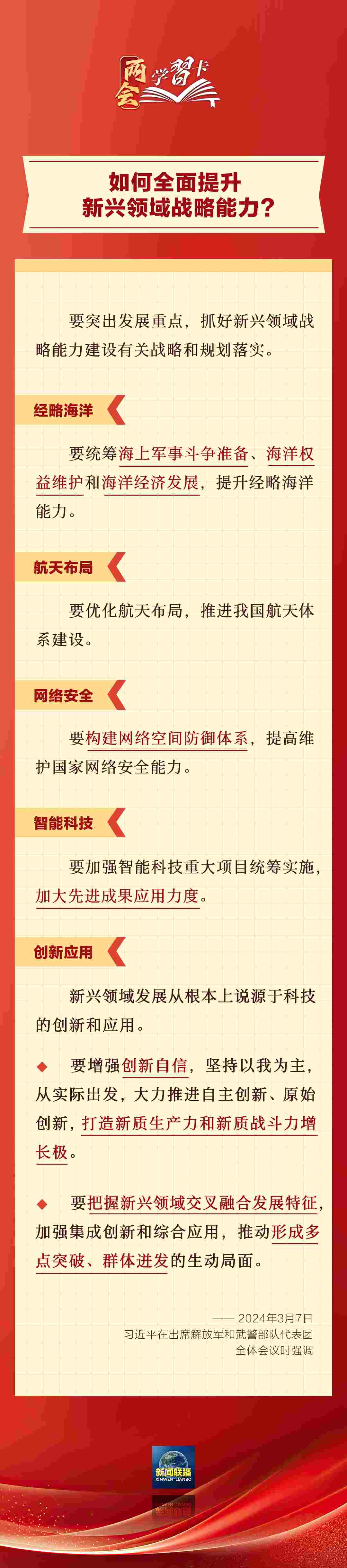 3月7日,習(xí)近平在出席解放軍和武警部隊(duì)代表團(tuán)全體會議時(shí)強(qiáng)調(diào),強(qiáng)化使命擔(dān)當(dāng),深化改革創(chuàng)新,全面提升新興領(lǐng)域戰(zhàn)略能力。如何提升新興領(lǐng)域戰(zhàn)略能力?一起學(xué)習(xí)↓↓↓