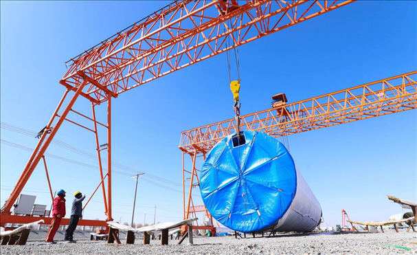 △ 2024年3月7日,甘肅省張掖市,工人們正在吊裝風(fēng)力發(fā)電機(jī)組塔筒,準(zhǔn)備運(yùn)往安裝現(xiàn)場。
