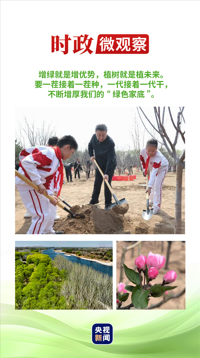 一次次揮鍬鏟土、培土圍堰、提水澆灌,總書記身體力行、率先垂范,就是要號召大家都行動起來,積極參與植樹造林,人人爭當(dāng)綠色使者、生態(tài)先鋒,為建設(shè)美麗中國增綠添彩,共同譜寫人與自然和諧共生的中國式現(xiàn)代化新篇章。