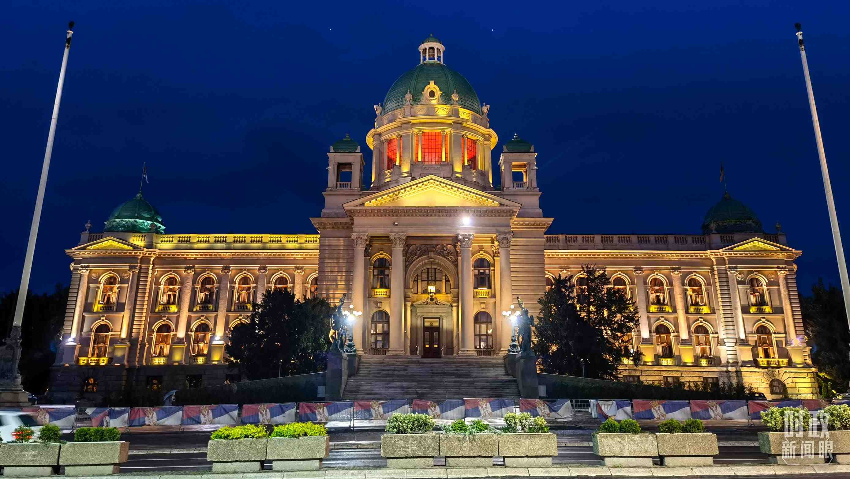 △塞爾維亞國會大廈亮起紅燈,歡迎習(xí)主席到訪。(總臺央視記者石丞拍攝)