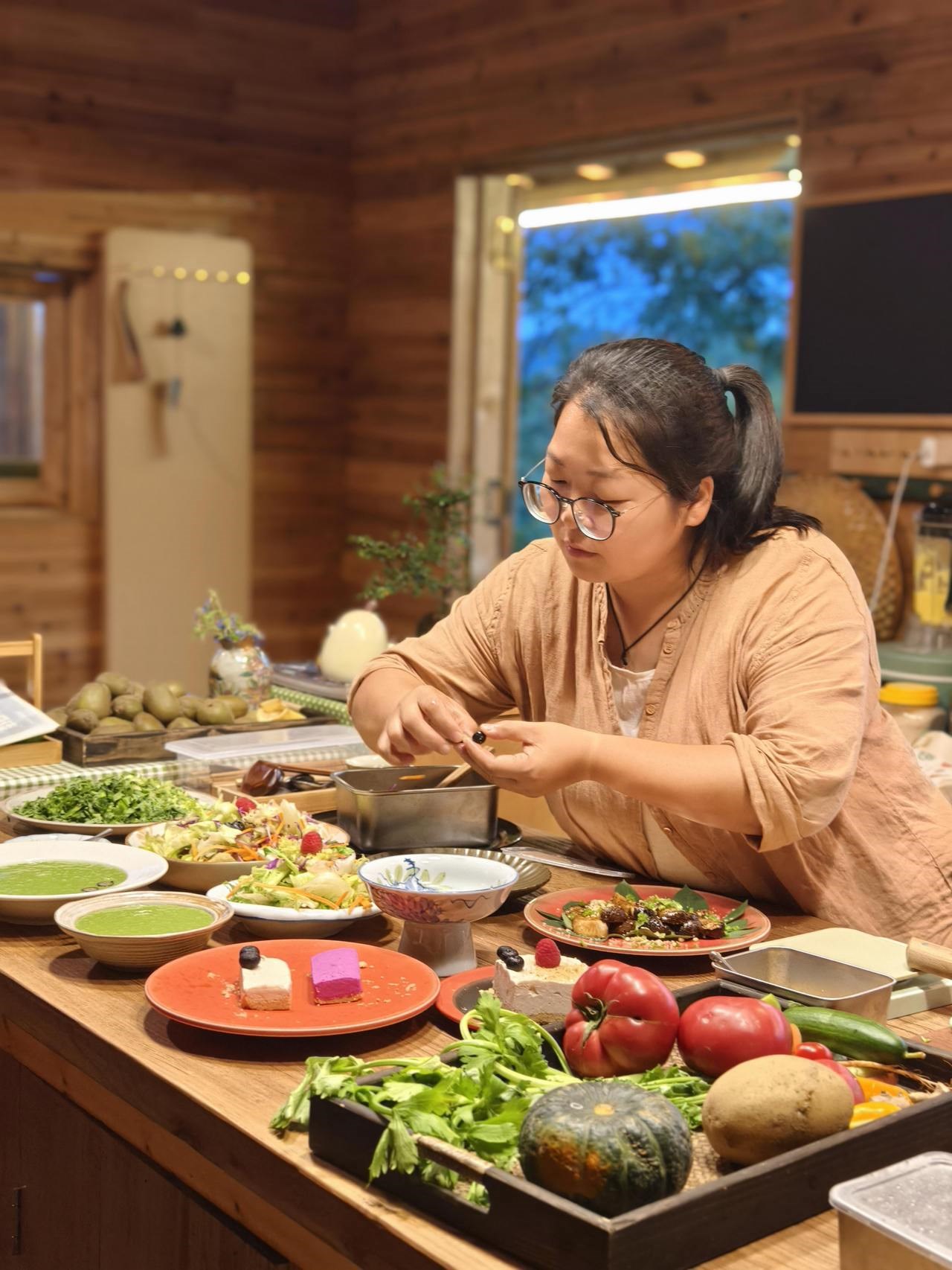 青年創(chuàng)客封玲在南瓜家森林廚房制作菜品。受訪者供圖
