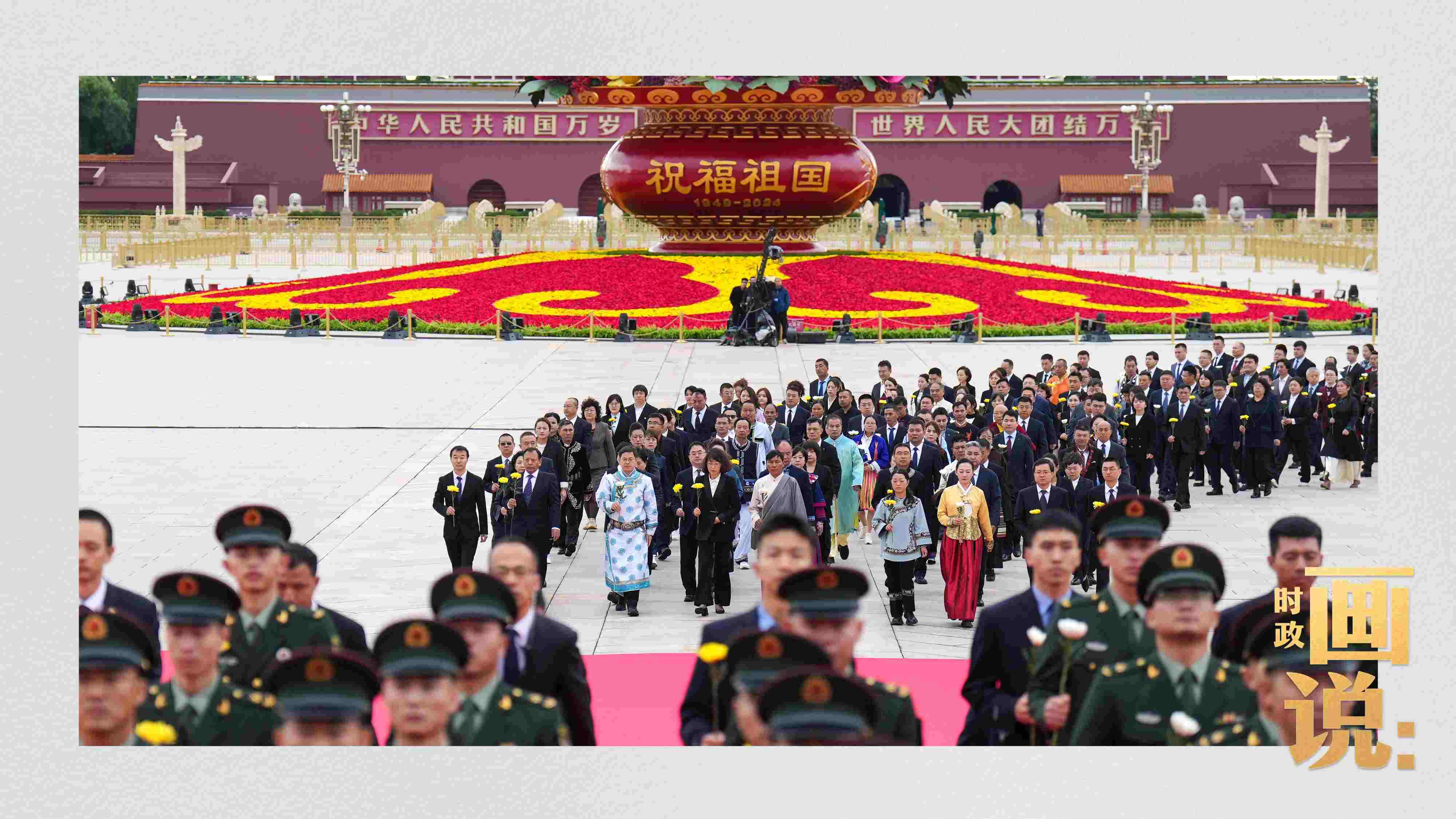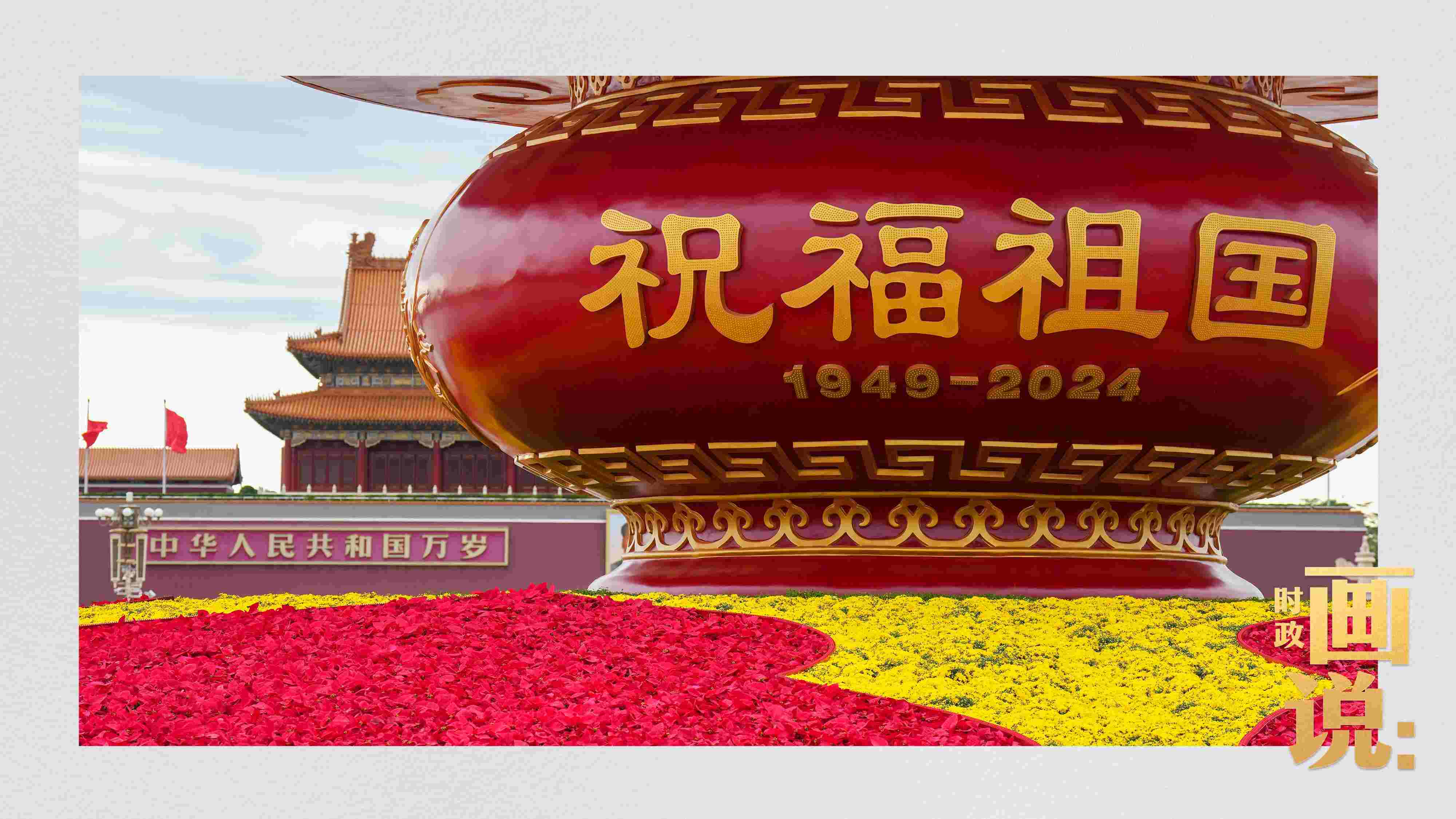 △天安門廣場中央,“祝福祖國”巨型花籃表達(dá)著對國家繁榮富強(qiáng)的美好祝福。