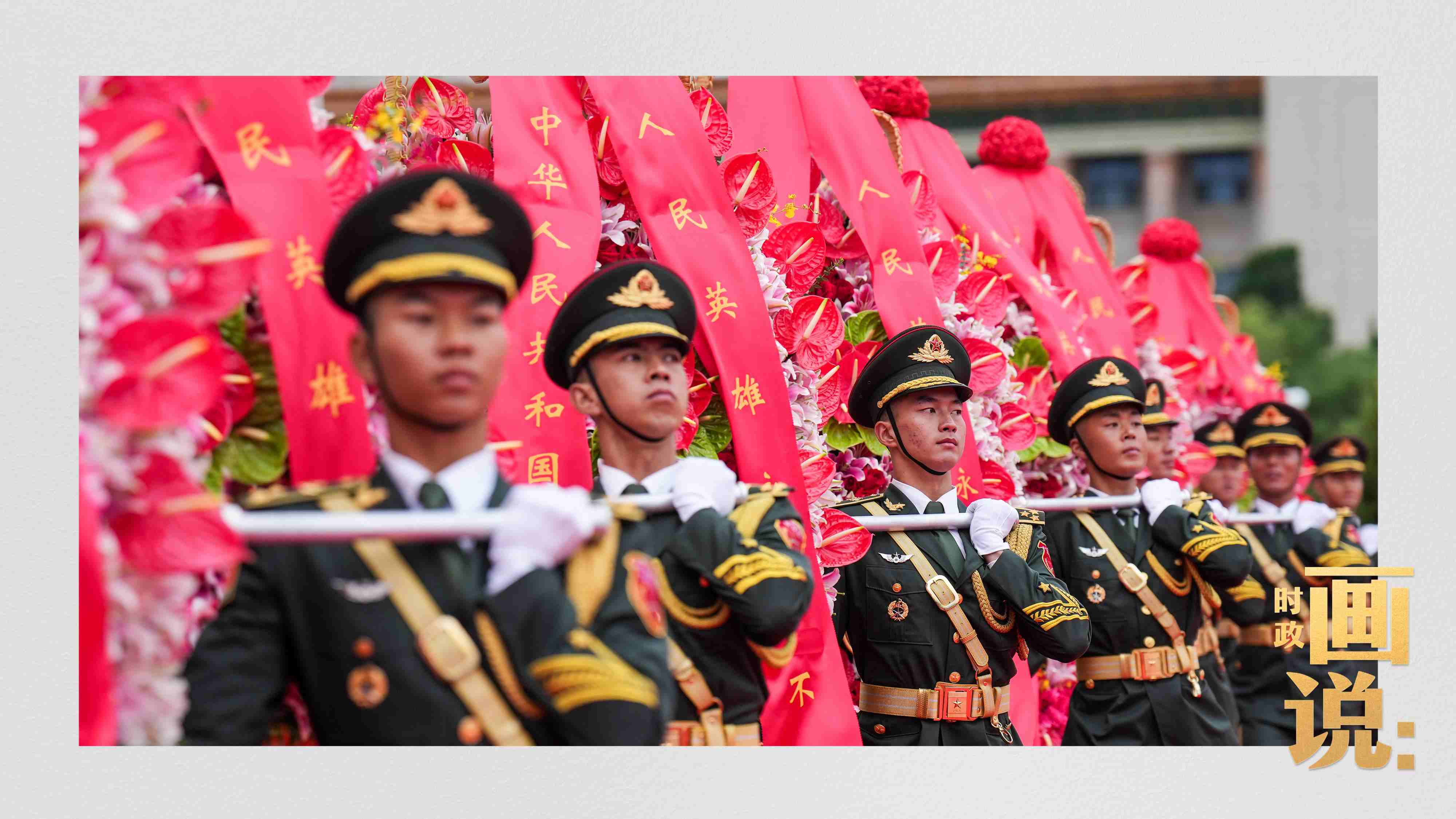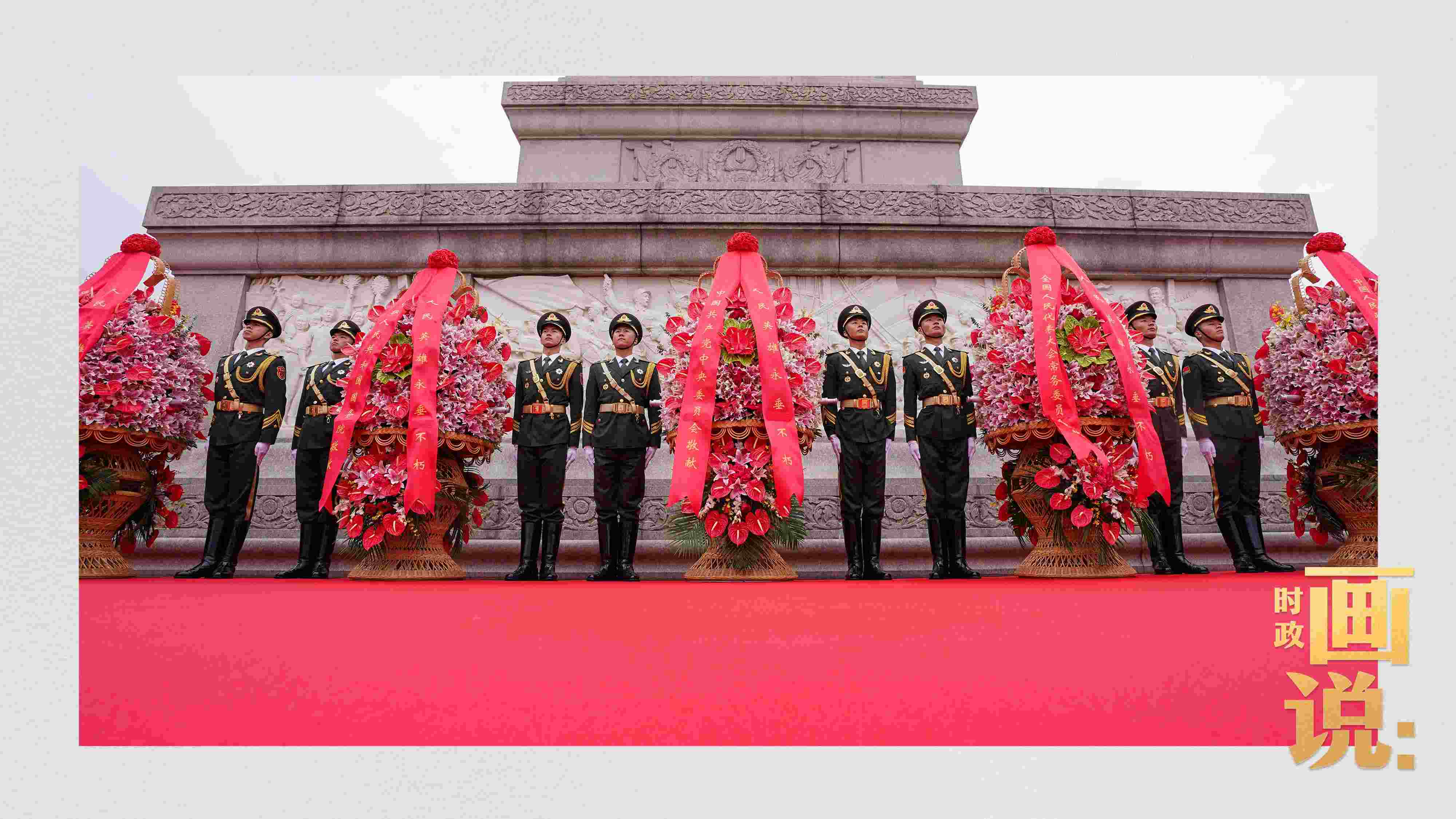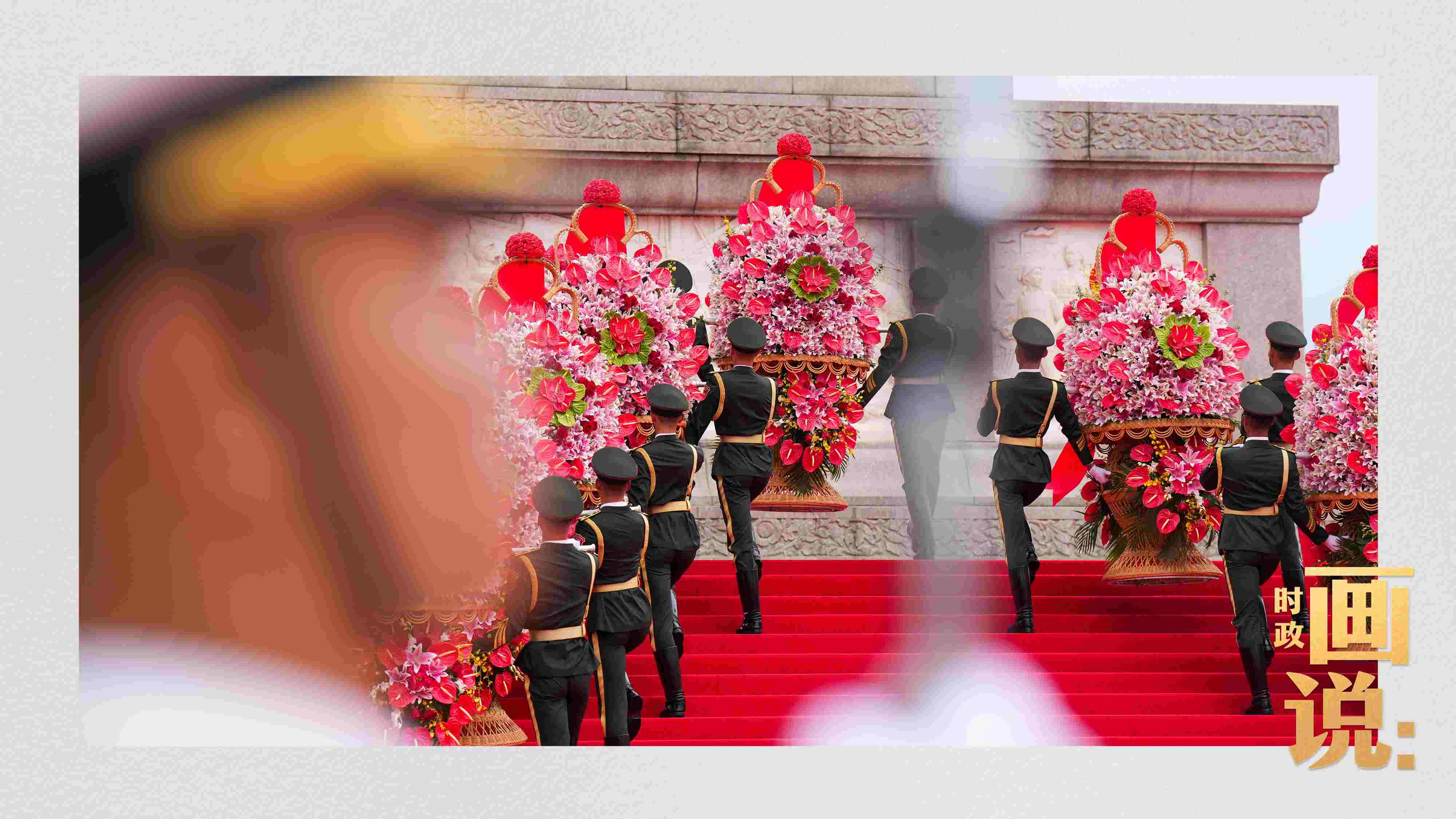 △禮兵抬起花籃,緩步走向人民英雄紀(jì)念碑。