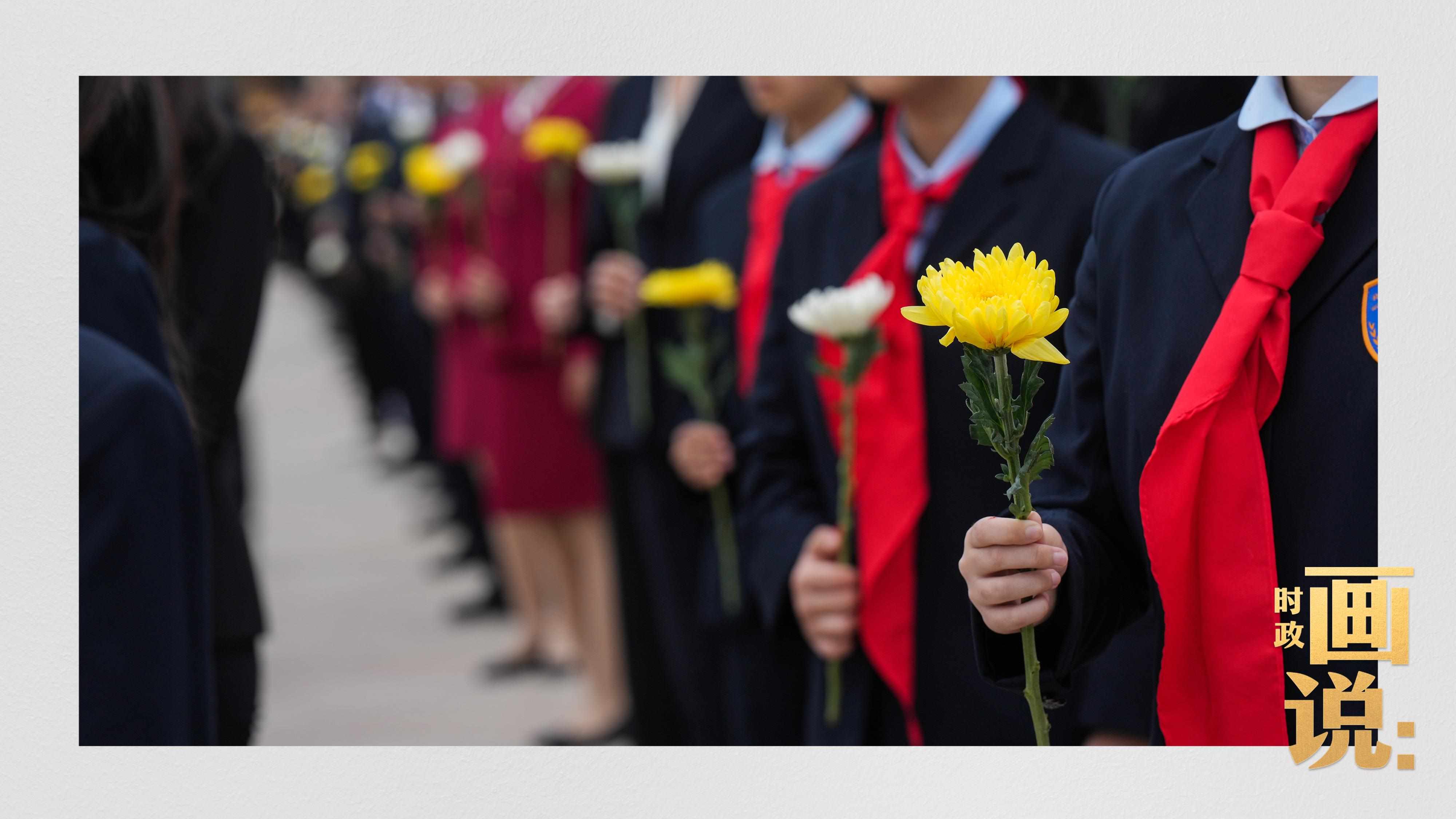 △少年兒童和各界代表依次走到紀(jì)念碑前,獻(xiàn)上手中鮮花并瞻仰紀(jì)念碑。