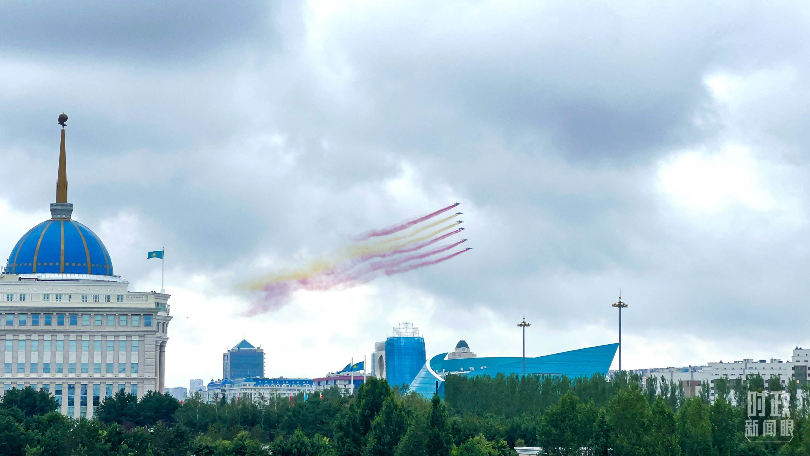 習(xí)主席乘車(chē)抵達(dá)哈總統(tǒng)府時(shí),托卡耶夫總統(tǒng)熱情迎接。六架哈薩克斯坦空軍戰(zhàn)機(jī)從總統(tǒng)府上空飛過(guò),拉出象征中國(guó)國(guó)旗色彩的紅黃色彩煙,以最高禮儀歡迎中國(guó)貴賓。