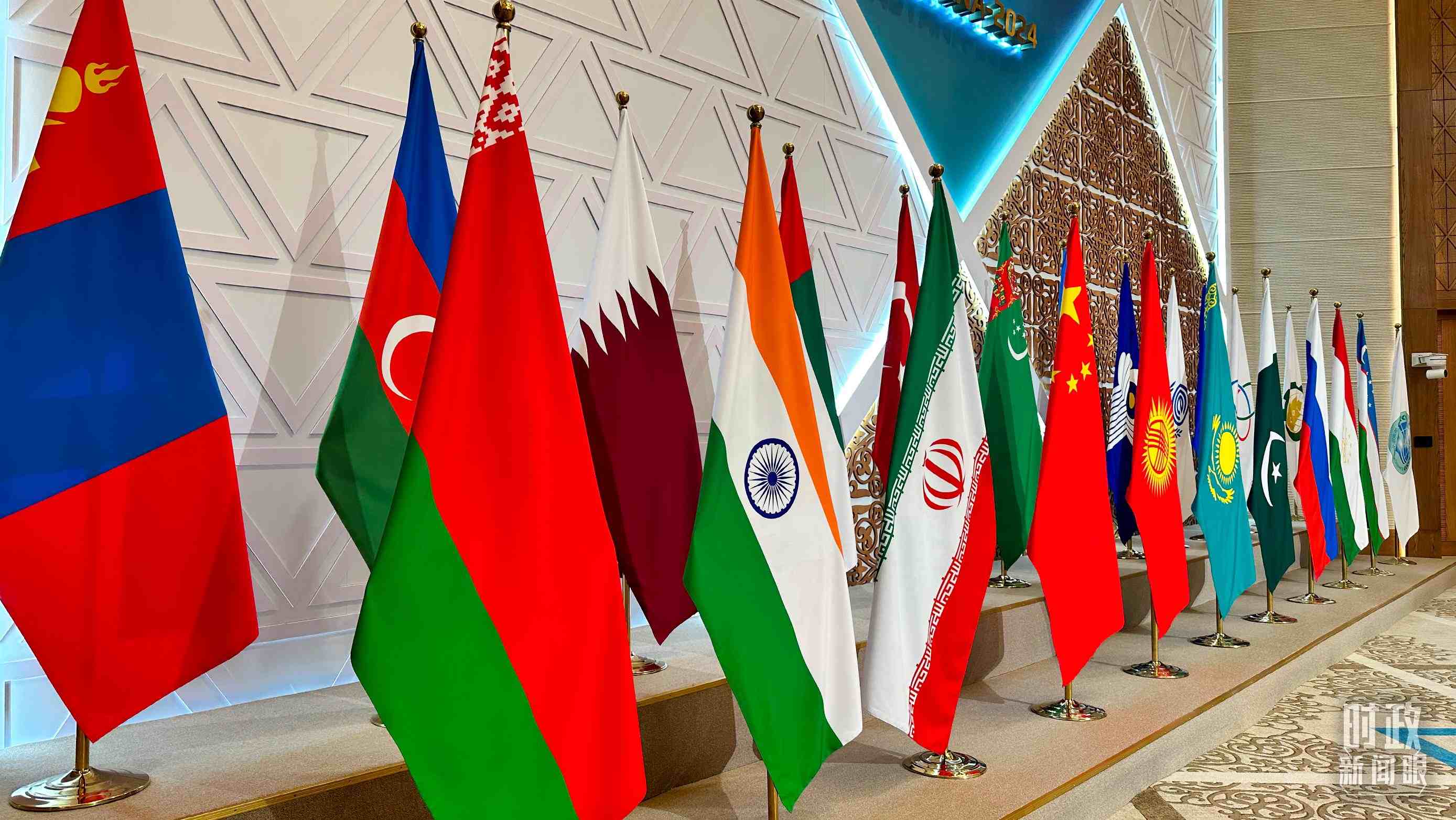 △阿斯塔納峰會(huì)現(xiàn)場擺放的旗幟。(總臺央視記者關(guān)舟拍攝)