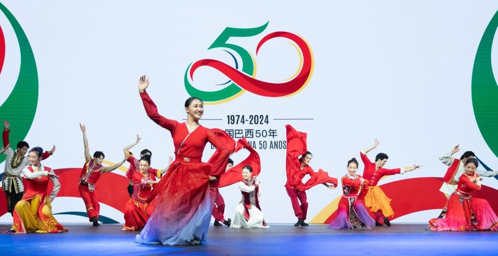 △當地時間2024年8月15日,在巴西首都巴西利亞,來自北京舞蹈學院民族舞團的演員在慶祝中巴建交50周年招待會上表演。